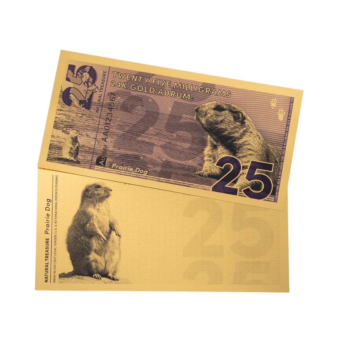 The 25 milligram Prairie Dog Aurum® gold bill is a special, limited-edition add-on to the existing Natural Treasure Aurum® series (which would complete the collection for a total of six bills). The bill showcases a Prairie Dog in Pawnee Butte, located in Northeast Colorado. On the front side of this bill, an observant and social prairie dog is featured as a large profile on the right and a small reverse in the lower left. In the upper right corner, there are pure gold paw prints showcasing the small but mighty prairie dog’s classic gait. Multiple levels of micro-printing and security elements have been embedded throughout the artwork.