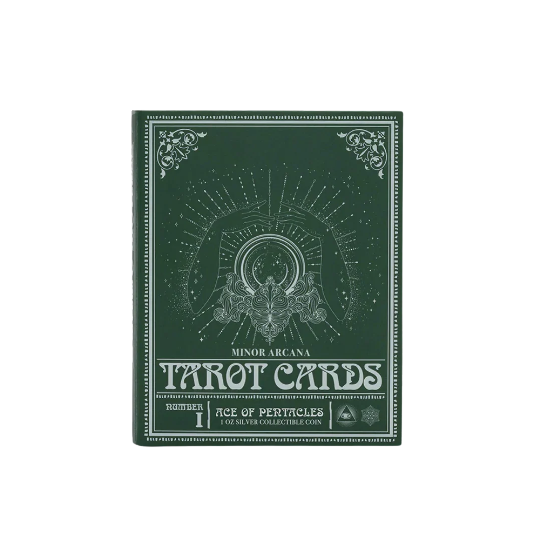 The third card is drawn. The Ace of Pentacles joins our 1oz 999 pure silver Tarot Minor Arcana series with a design rooted in prosperity, grounding, and new beginnings. The artwork is framed with a mirror-finish border, and a shimmering green triangle sits in the top left corner, representing Earth, the alchemical symbol of the Pentacles Suit.Â